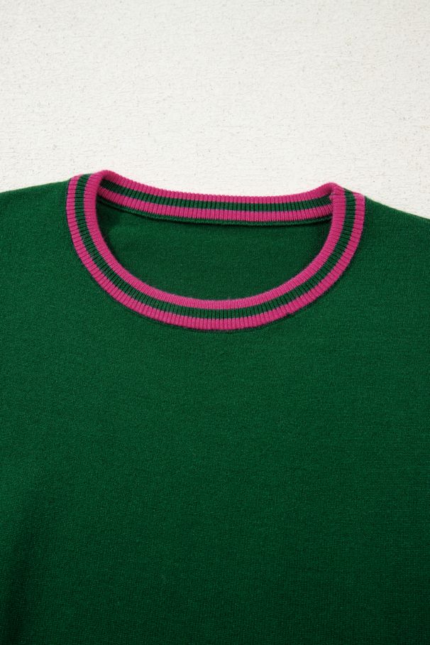 - Chic green sweater featuring colorful floral patchwork sleeves with shirred cuffs and a pink-accented neckline.