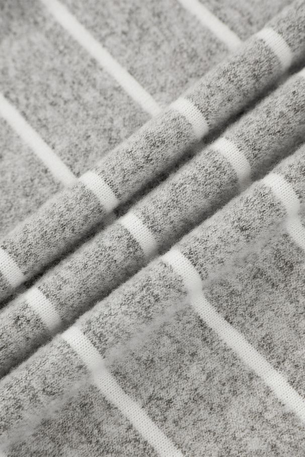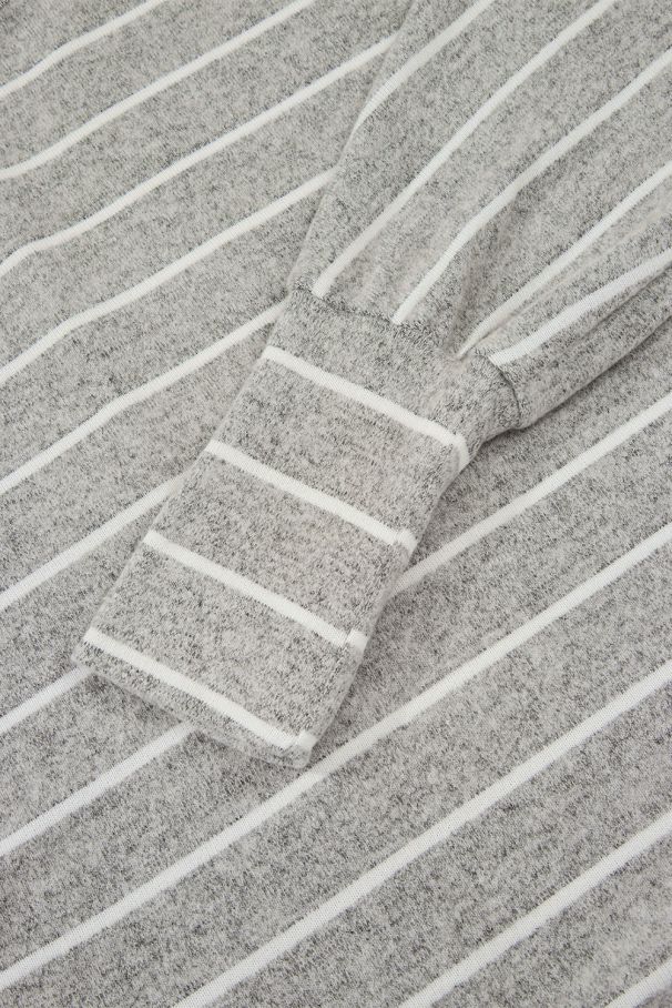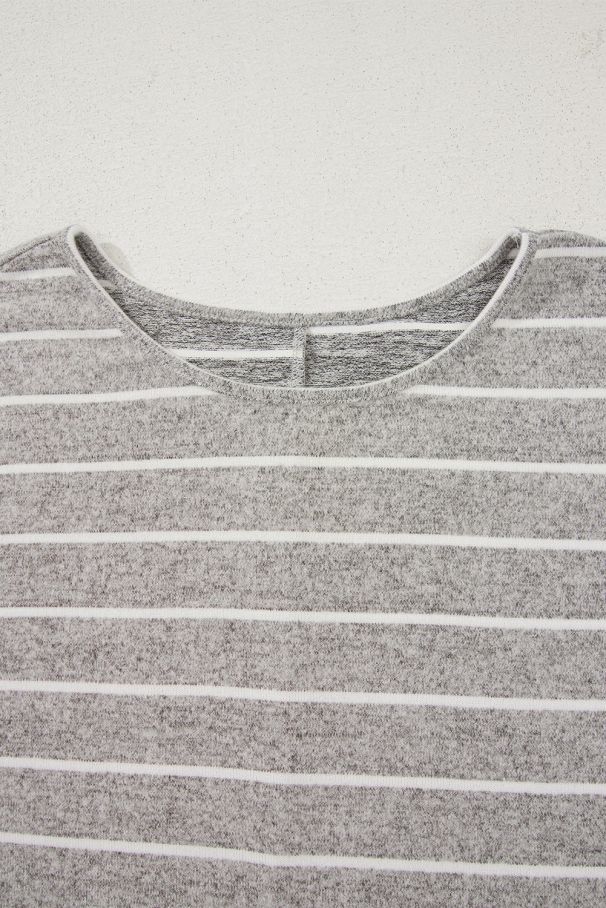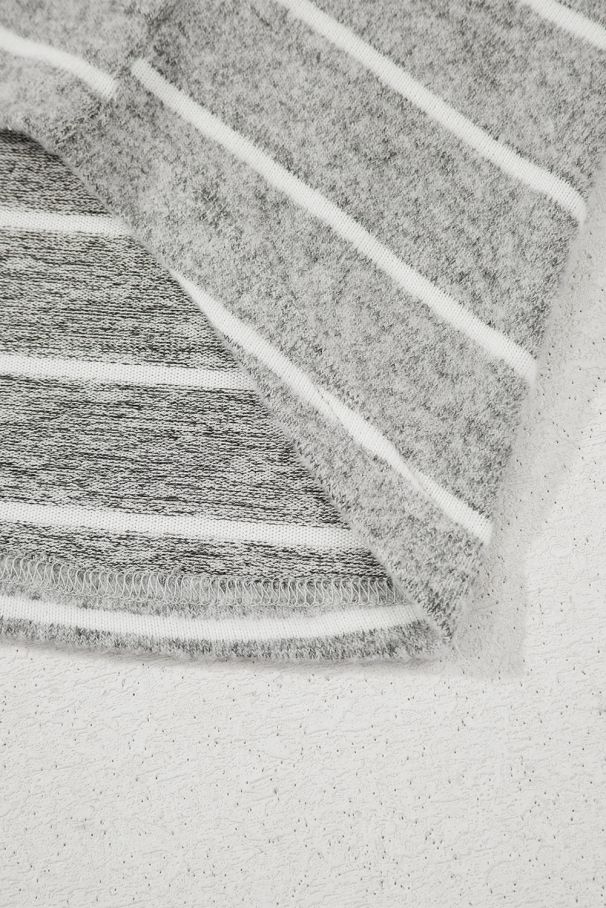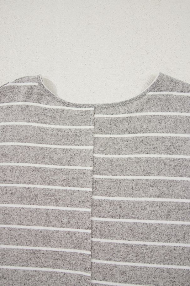 - A soft gray blouse with delicate horizontal stripes and a relaxed fit.