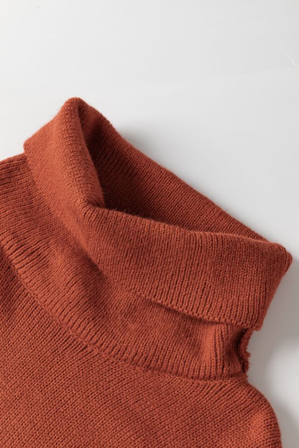• Trendy color block sweater in brown, beige, and black tones, featuring a cozy turtleneck and relaxed fit.