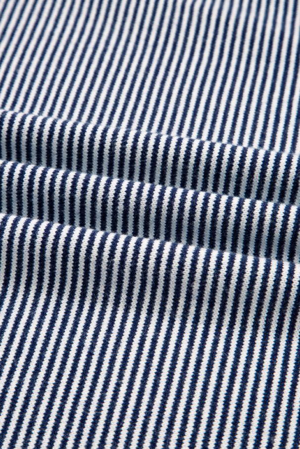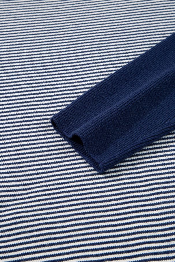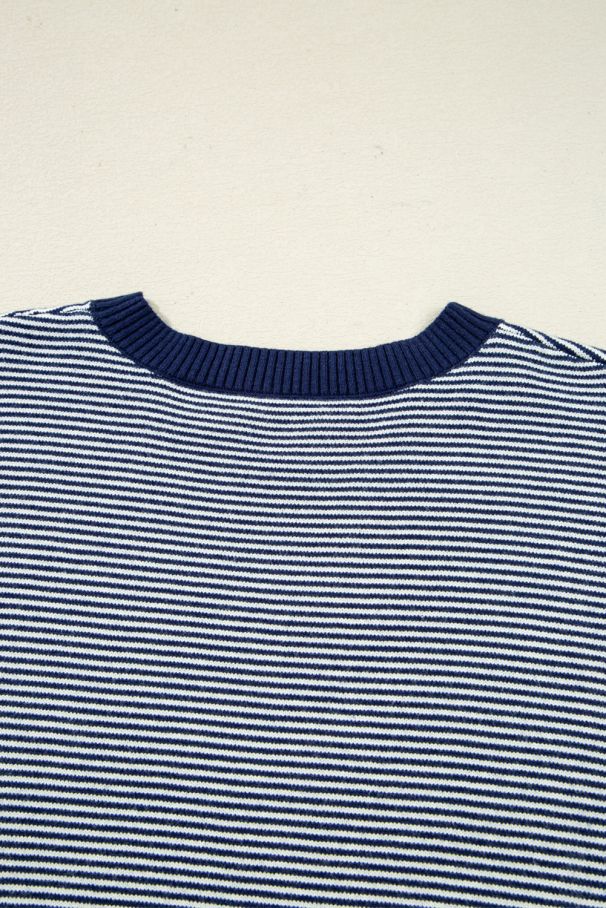 • Soft and cozy oversized women’s sweater in a navy and white color block design with fine stripes.