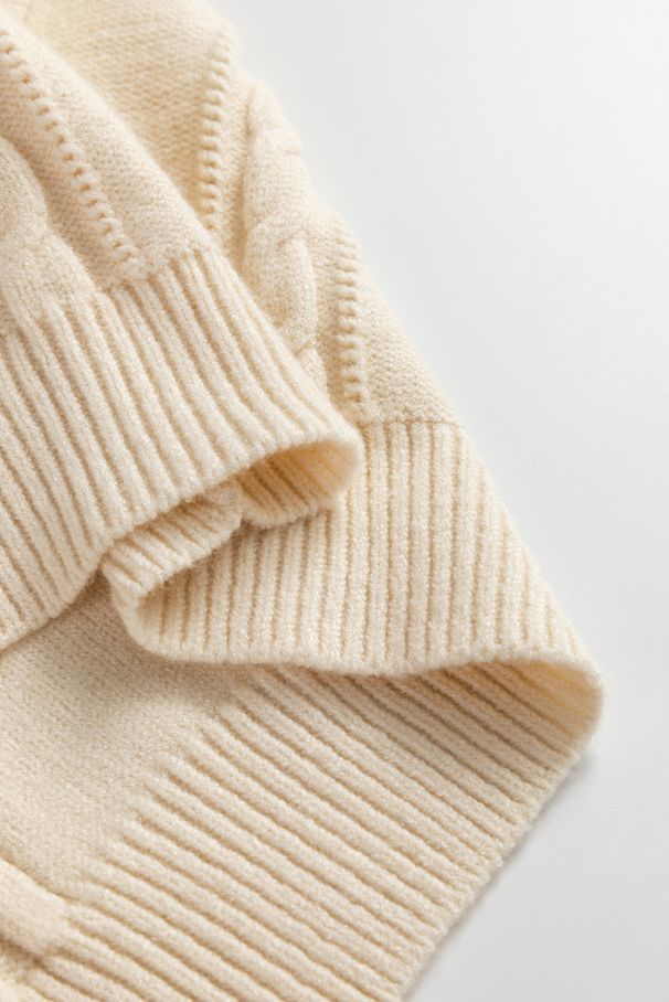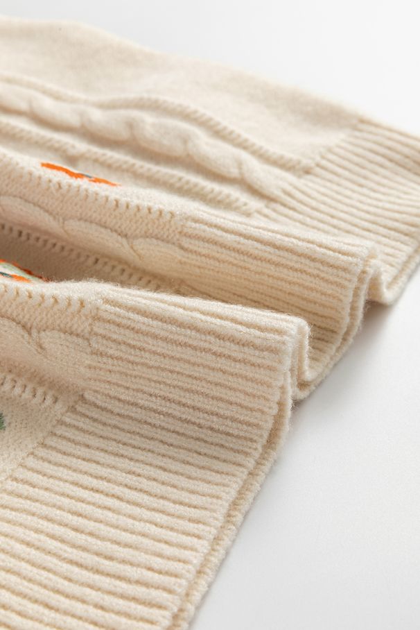 - A soft and stylish sleeveless knitted sweater in beige, featuring classic cable-knit texture and vibrant floral embroidery.