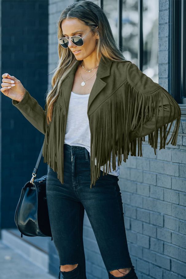- Add a touch of boho charm to your look with this green cropped faux suede jacket.
