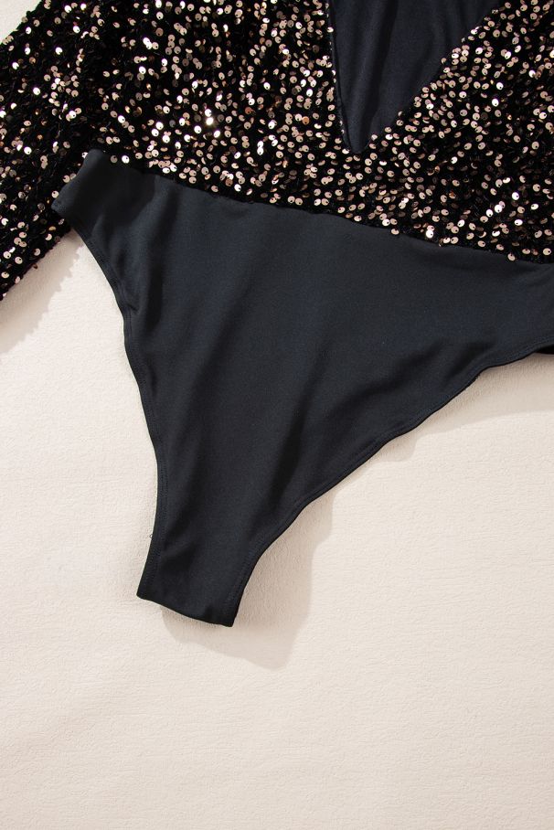 - Elegant black sequin bodysuit designed to shine at every occasion.