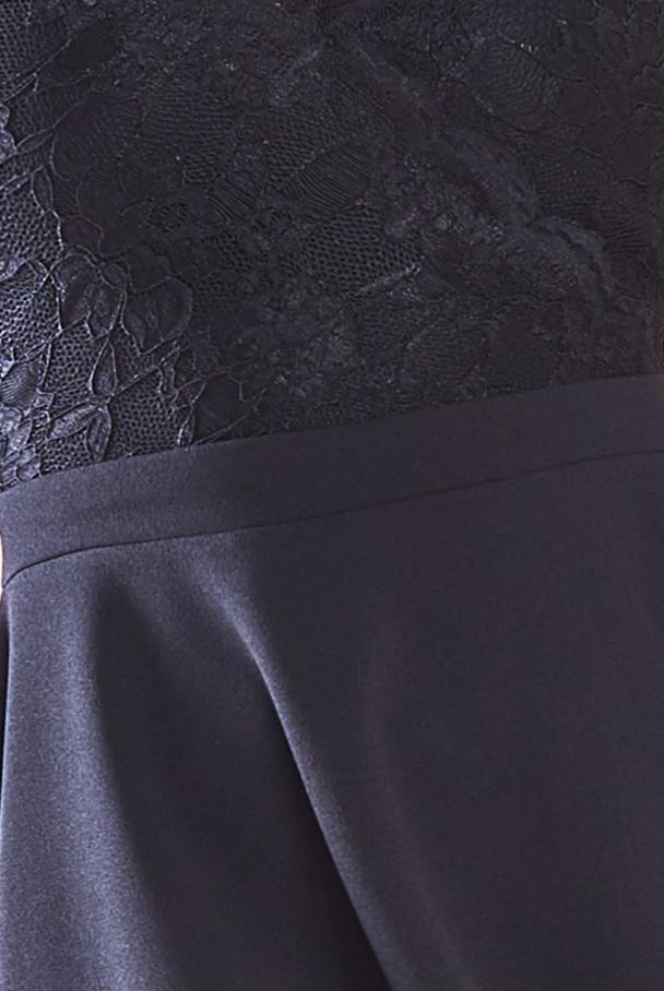 • An elegant black dress featuring a delicate lace top with long sleeves and a flattering V-neckline.