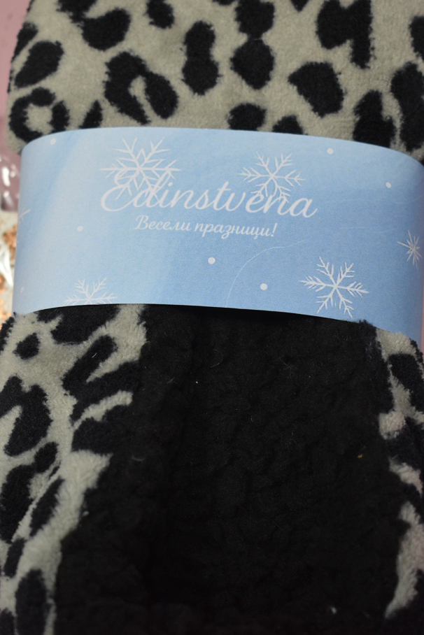 - Soft and warm slippers with a leopard print, plush inner lining and anti slip sole.