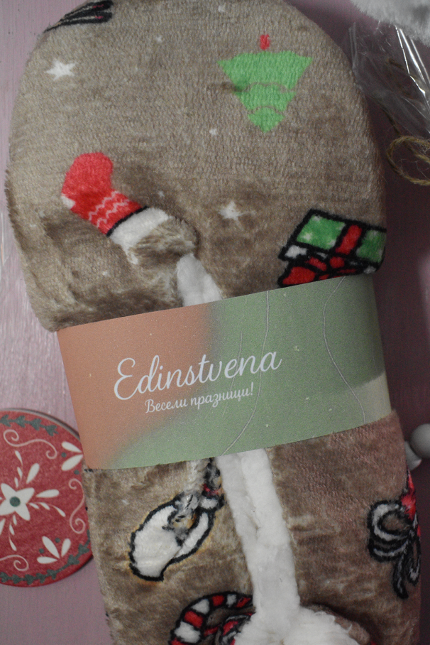 - Soft and warm beige slippers with festive motives - Christmas trees, mittens, gifts and candy canes.