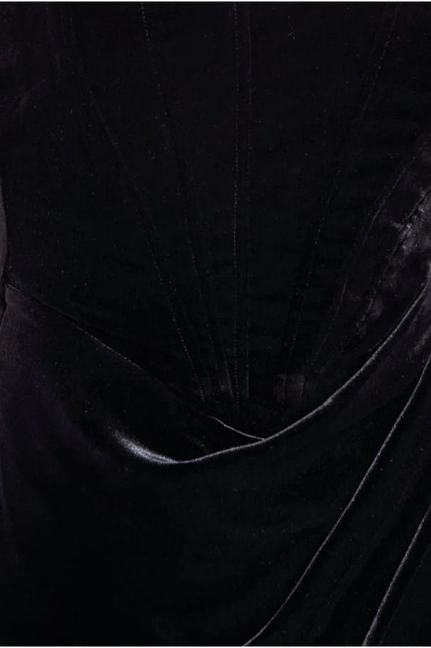 Women's Black Velvet Corset Maxi Dress with Draped Shoulders GODDIVA