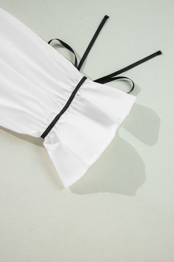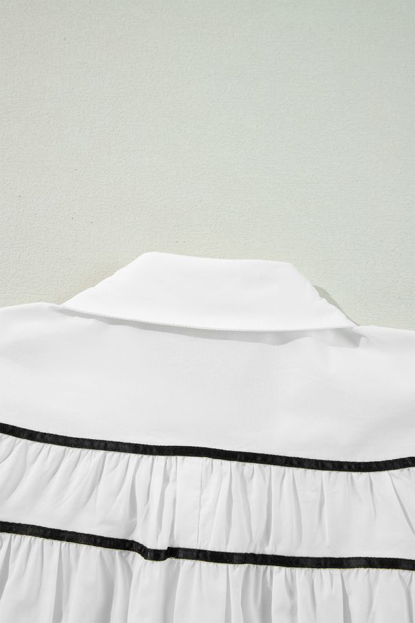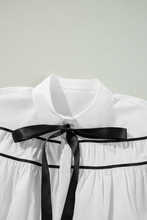 White Black Pipping Ribbon Bowtie Collared Ruffled Puff Sleeve Shirt