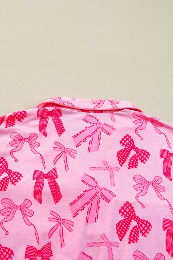 Pink Bow Knot Print Lapel Collar Short Sleeve and Pants Pajamas Set