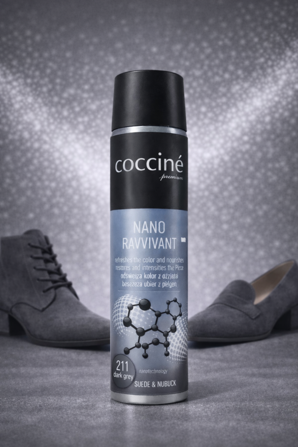 - Coccinè Nano Ravvivant suede and nubuck spray in dark grey is designed to refresh deep grey tones and restore the even, natural look of delicate materials.
