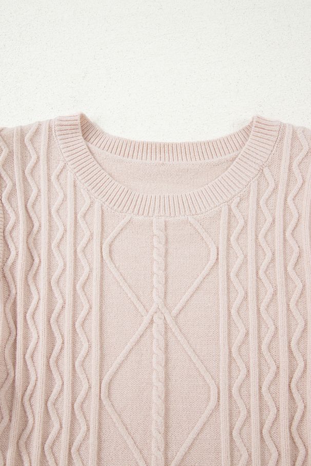 Women's Beige Cable Knit Sweater with Floral Contrast Sleeves