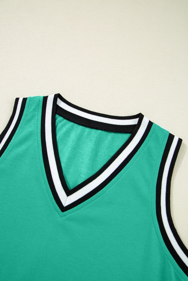 - Designed sleeveless with a V-neckline and contrast trim for a fresh, modern touch.