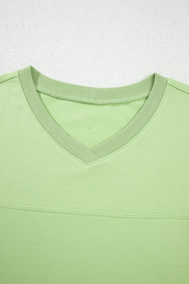 - Освежете гардероба си с този стилен и удобен комплект от широка тениска с V-образно деколте и къси панталони с връзки.