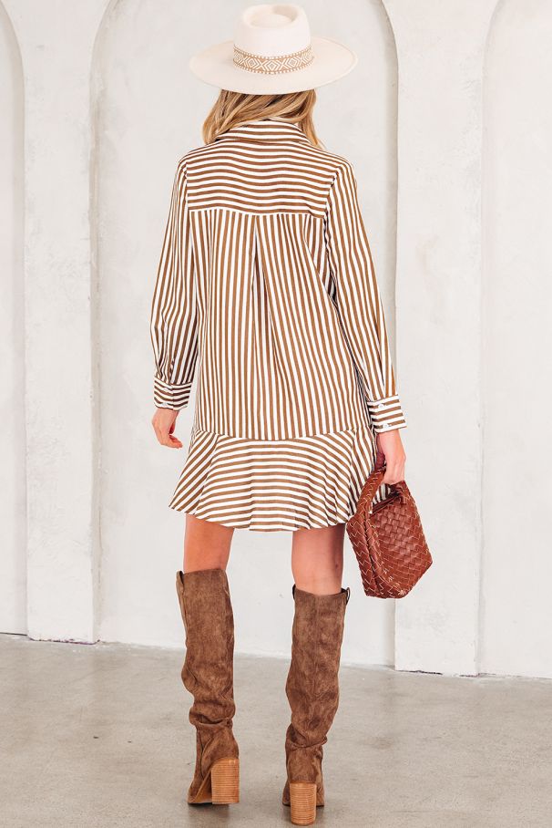 - Лека и ефирна рокля тип риза с дълъг ръкав и волани в долната част, изработена от удобна материя с кафяво-бяло райе.