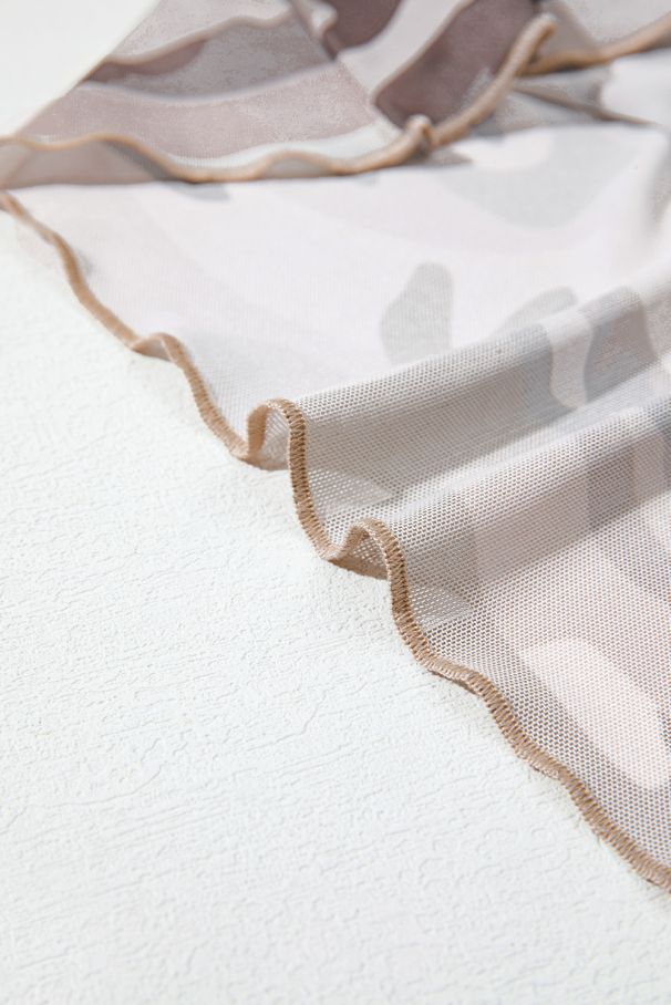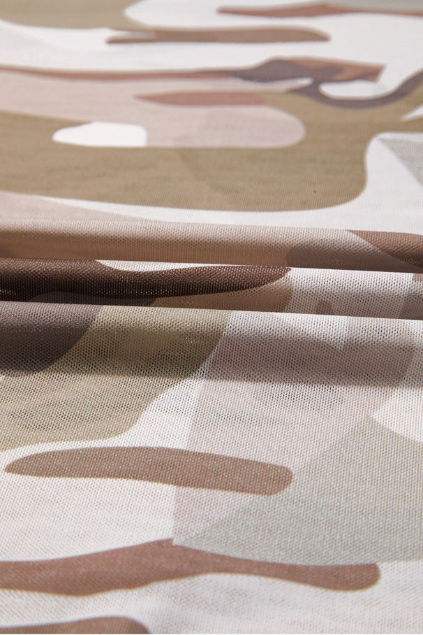 - Модерна дамска блуза от фина мрежа с дълъг ръкав и камуфлажен принт в меки земни тонове.
