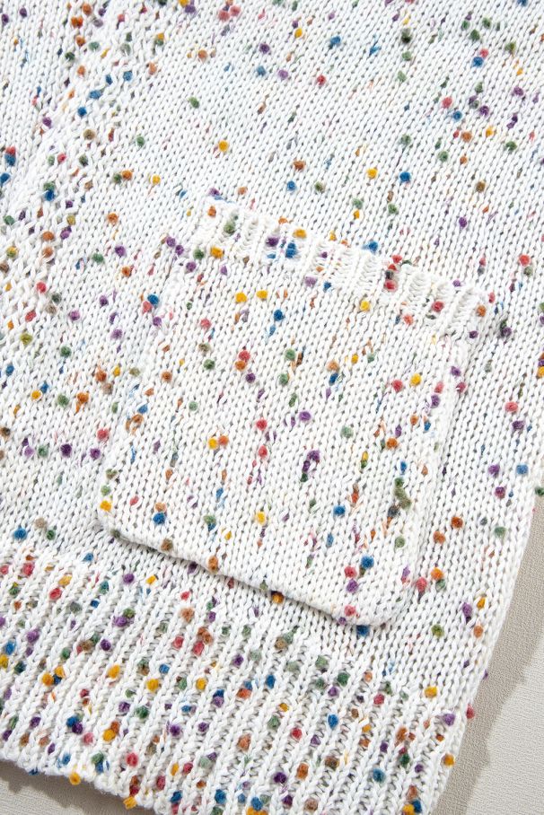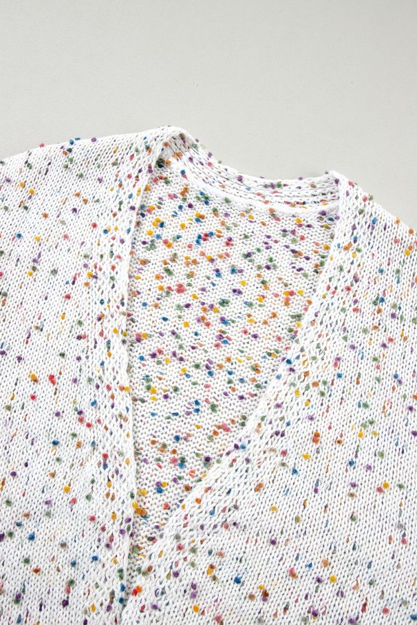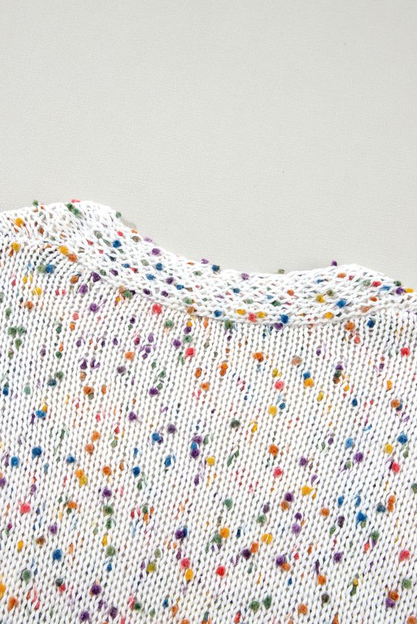 - Тази дамска дълга жилетка в бял цвят с вплетени цветни нишки е стилен и уютен избор за по-хладните дни.
