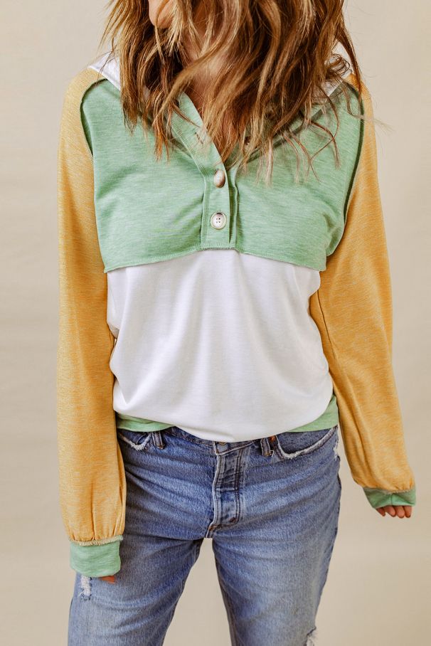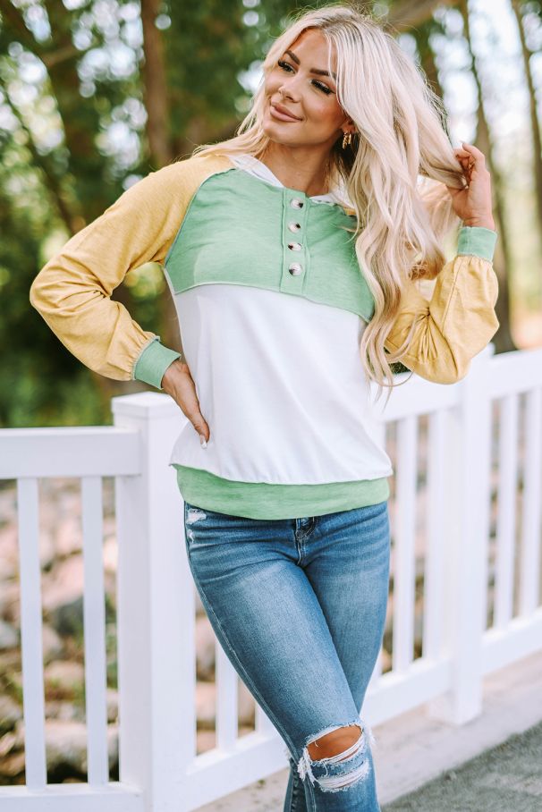 Дамски суичър с копчета и качулка в зелено, бяло и жълто