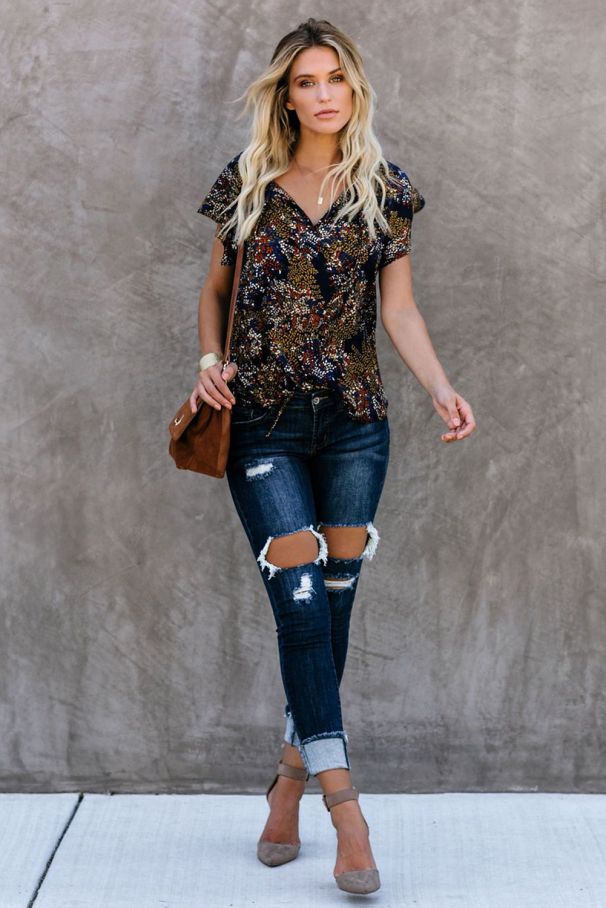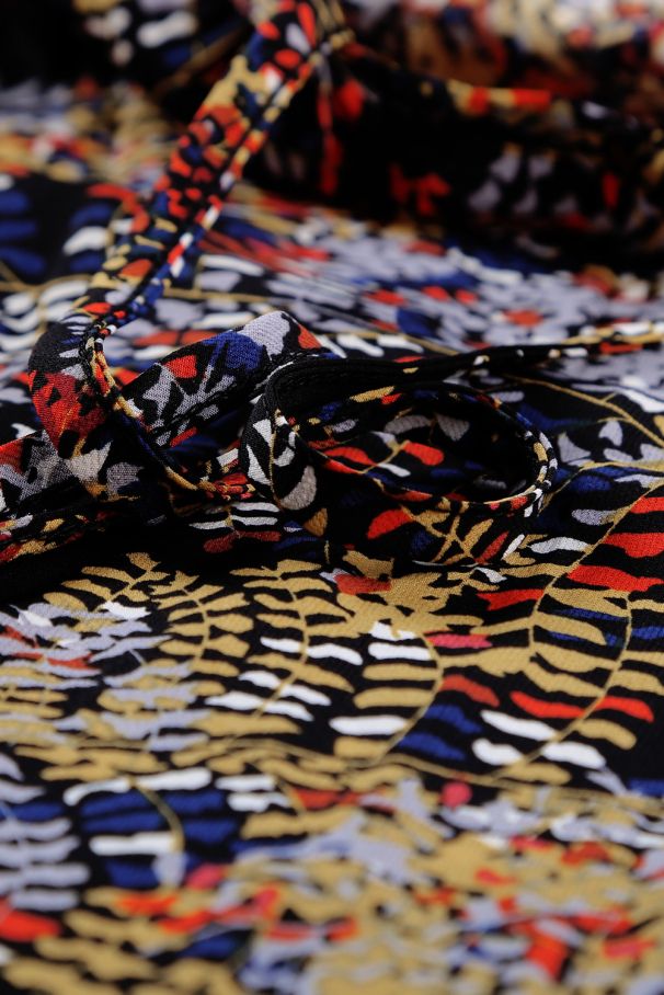 • Лека и удобна дамска блуза с пъстър принт в топли нюанси.