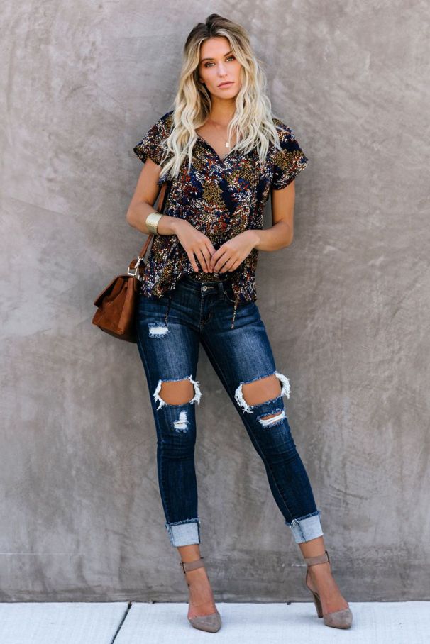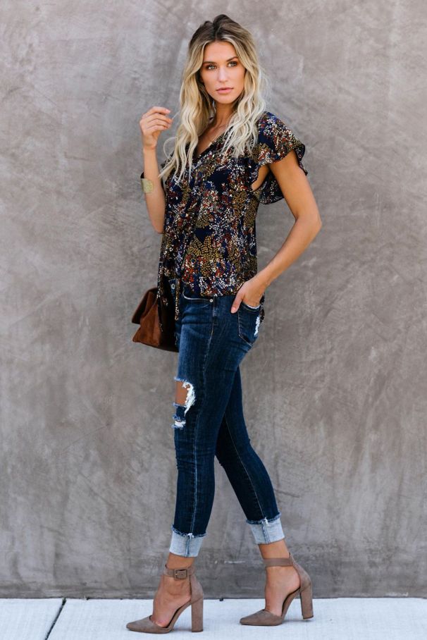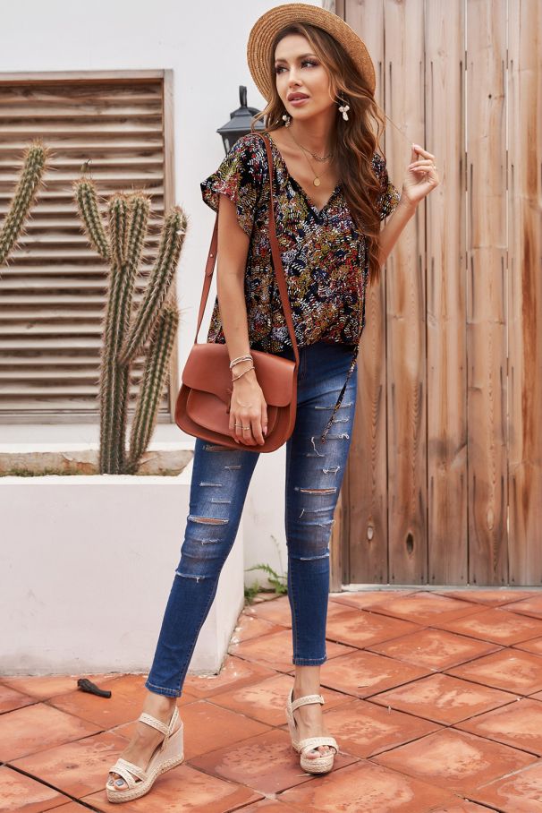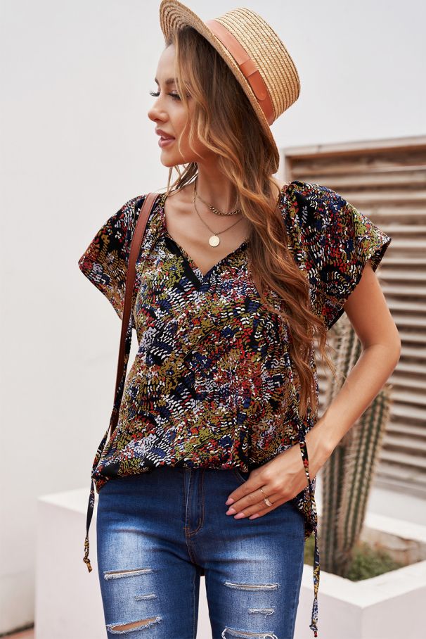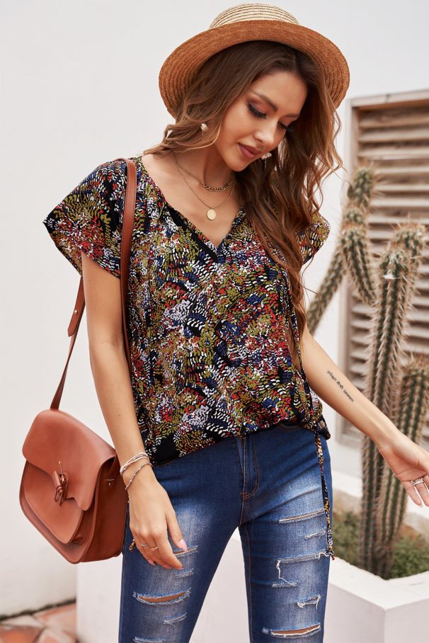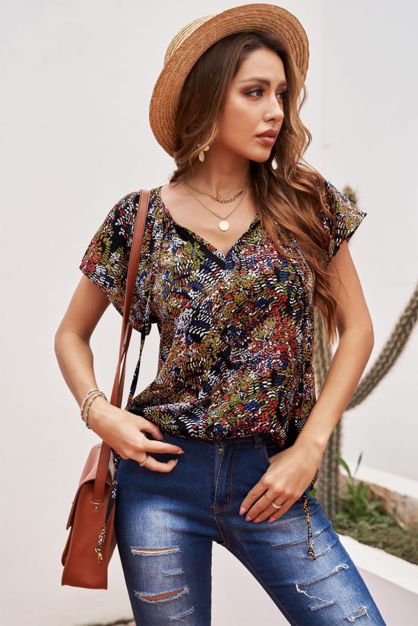 Дамска цветна блуза с къс ръкав и V-образно деколте