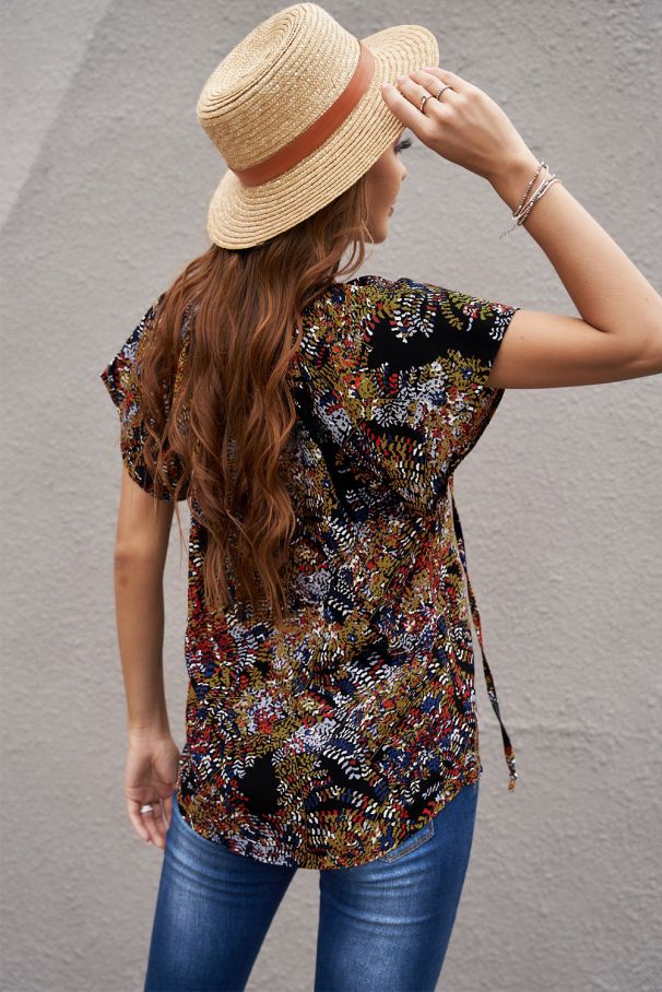 Начало Всички дрехи Дамска цветна блуза с къс ръкав и V-образно деколте