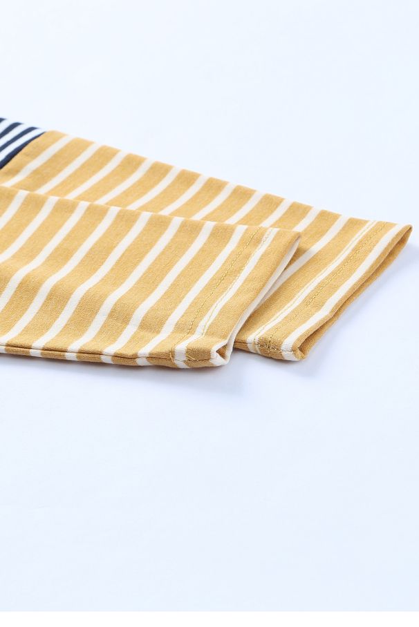 • Стилна дамска блуза с модерни хоризонтални райета, акцентирана с контрастни ръкави в горчичен нюанс.