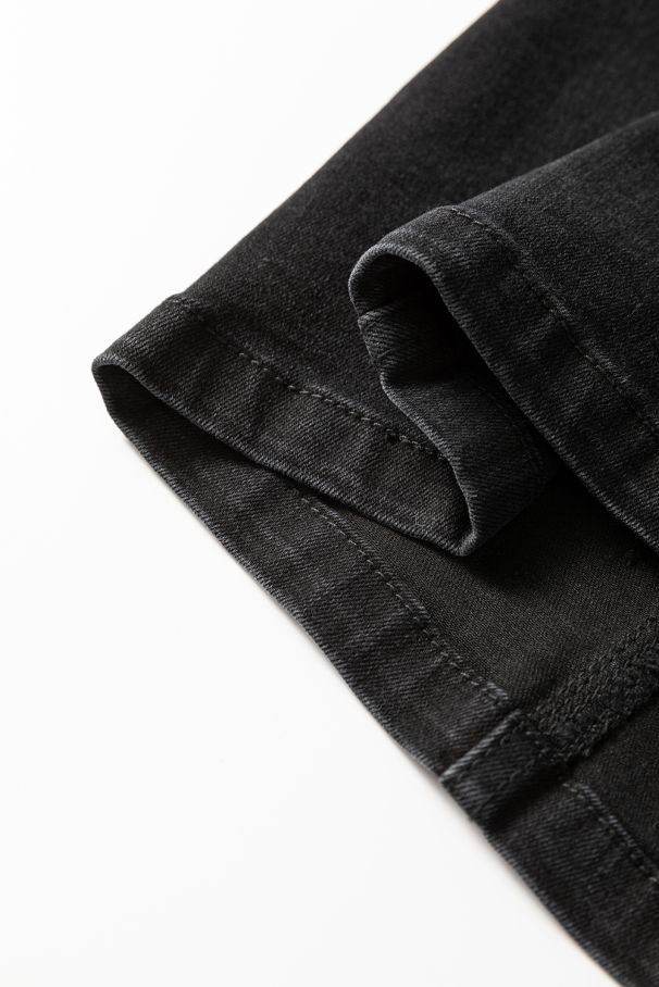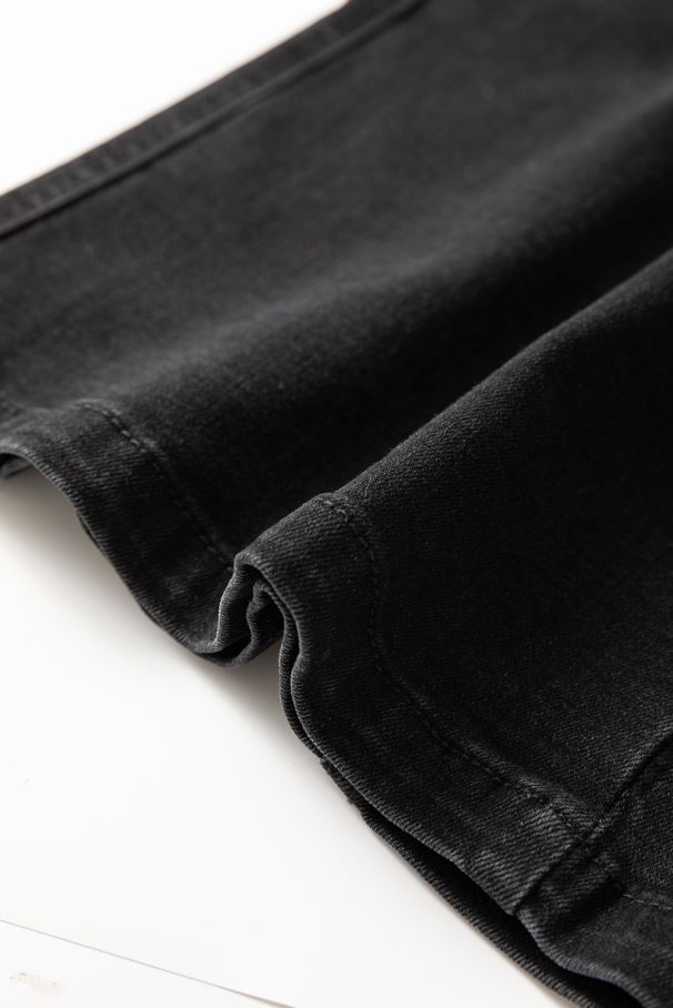- Модерна черна дънкова пола с висока талия и ефектно закопчаване с копчета отстрани.