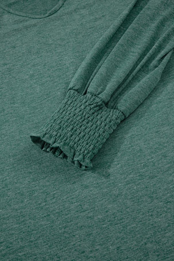 - Моделът е с V-образно деколте, ластични маншети и фини набори по раменете, които придават елегантен силует.