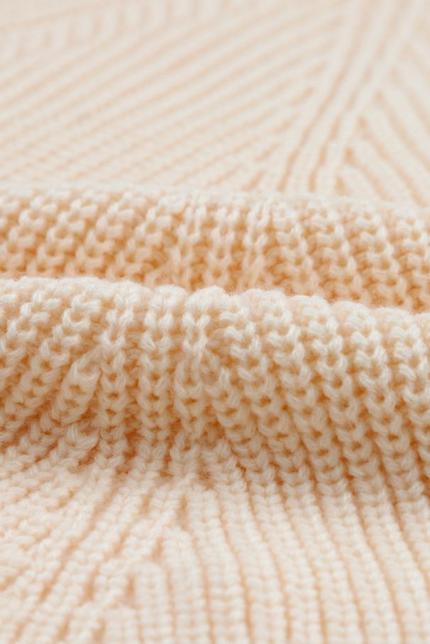 • Бежов пуловер с изискана ажурна плетка и мека текстура, която осигурява комфорт и стил през целия ден.