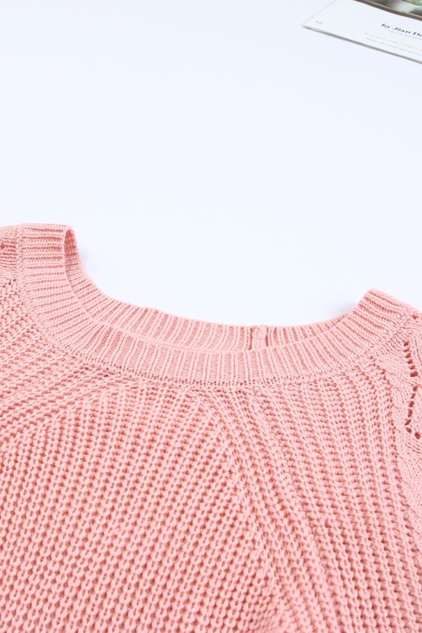 - Розов пуловер с изискана ажурна плетка и мека текстура, която осигурява комфорт и стил през целия ден.