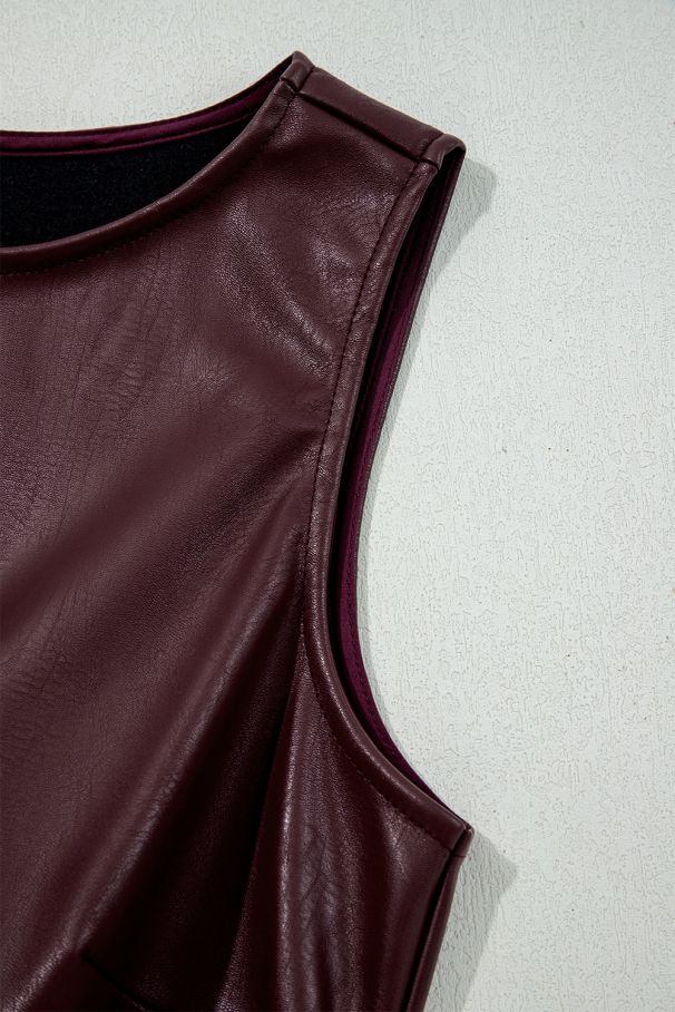 - Изчистената кройка без ръкави подчертава силуета, а меката и луксозна еко кожа осигурява комфорт и стил.