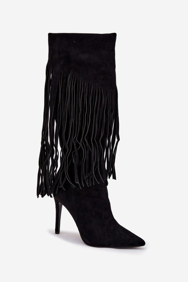 Дамски черни ботуши от еко велур с ресни и висок ток
