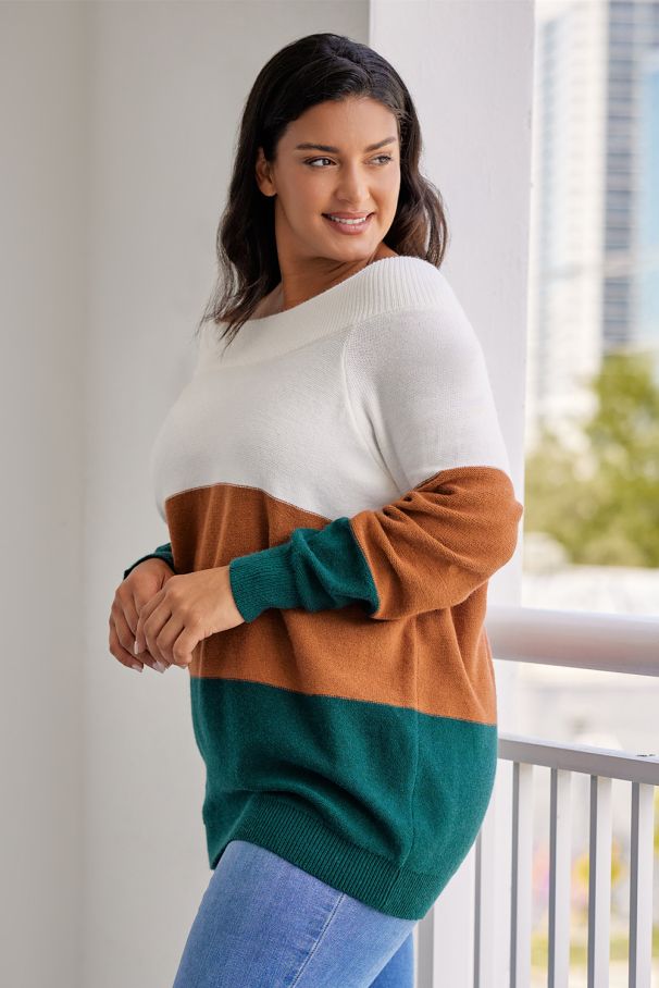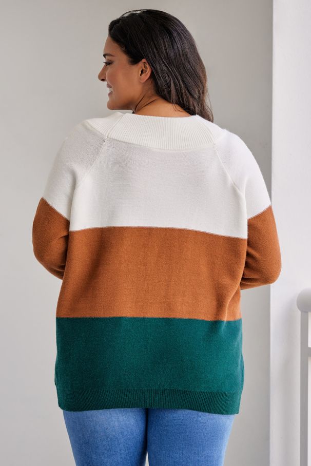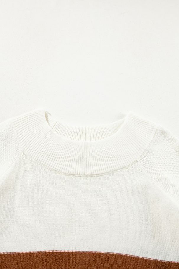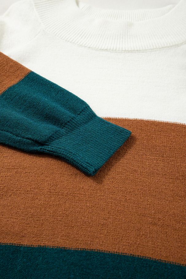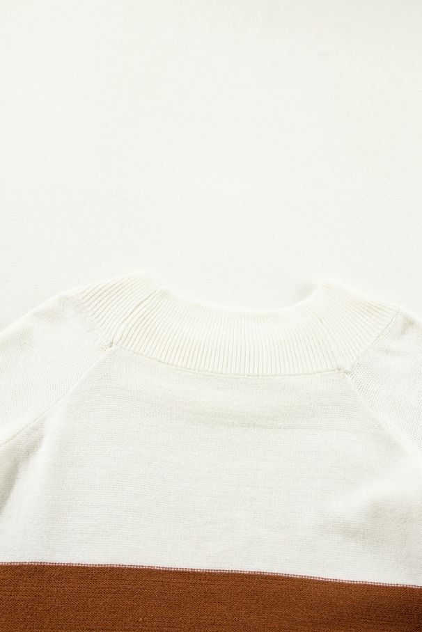 • Модерен дамски пуловер с широки цветни блокове в комбинация от бяло, карамел и тъмнозелено.