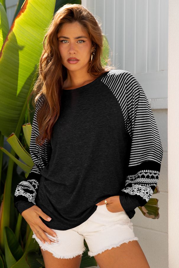 Дамска черна блуза с райета и дантелен акцент по ръкавите