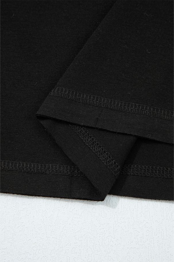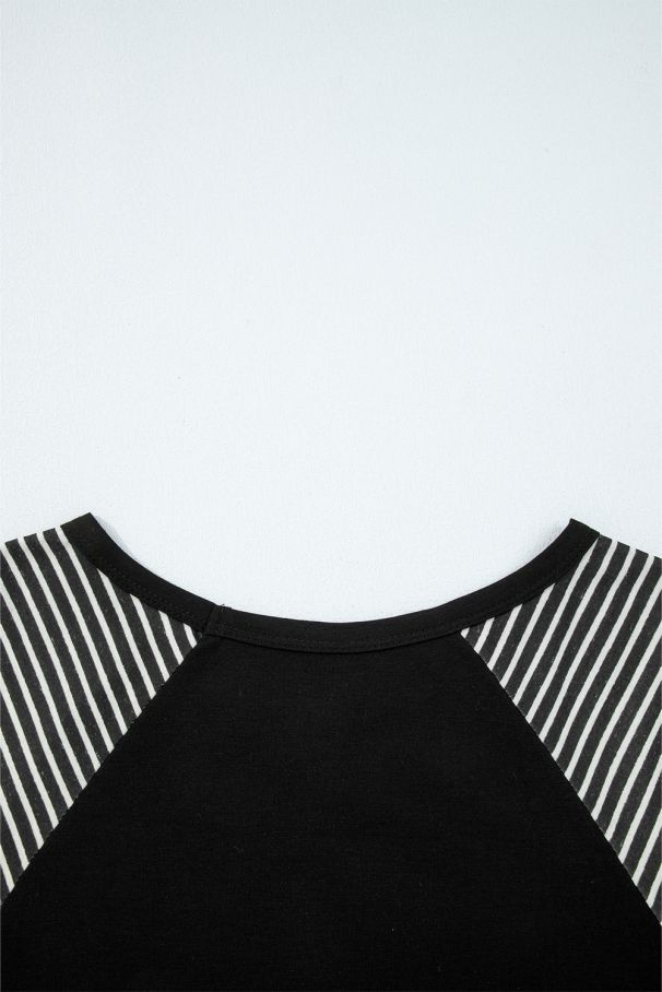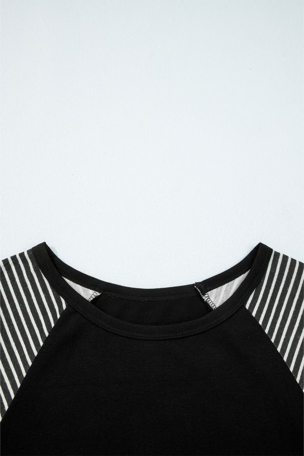 - Стилна и удобна дамска блуза с черно-бели райета по ръкавите и красив дантелен акцент в долната им част.