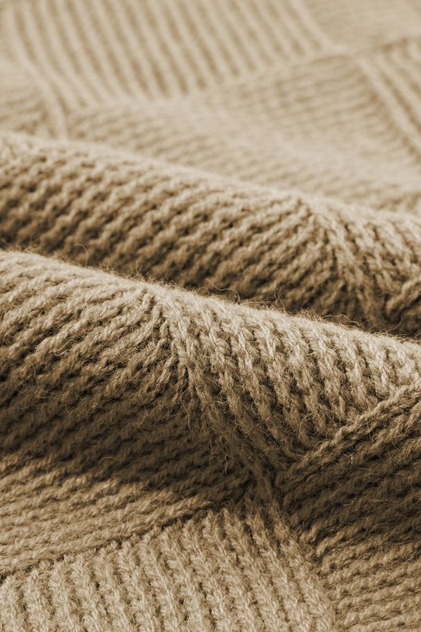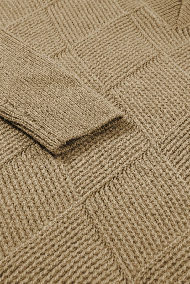 - Уютен и стилен плетен пуловер в топъл бежов нюанс, изработен с релефен квадратен десен.