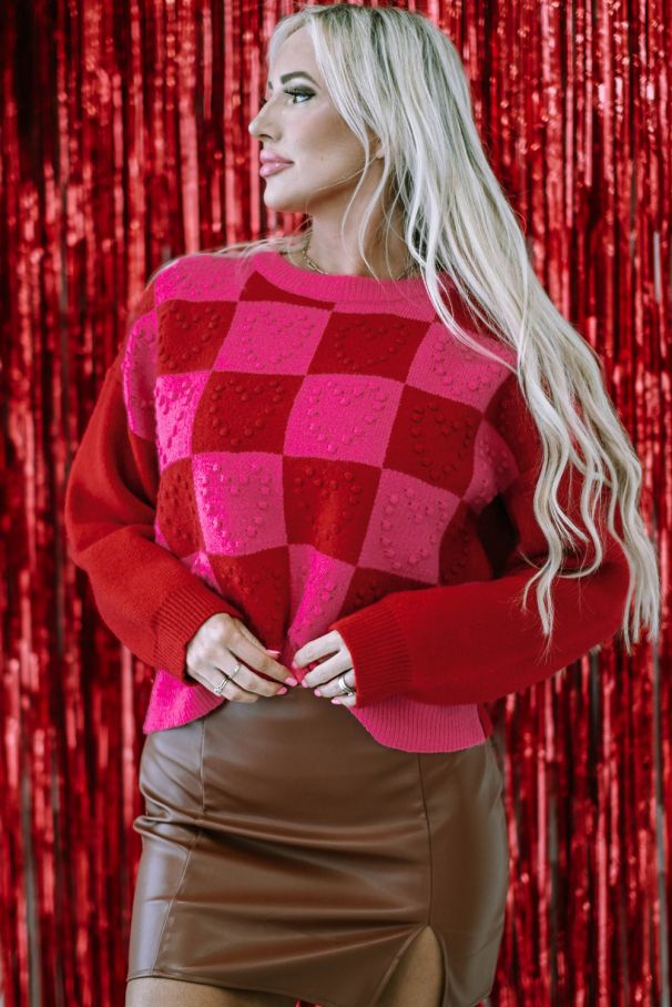 • Ефектен пуловер с шахматен дизайн в червено и розово, създаден да внесе настроение и стил в зимния ти гардероб.