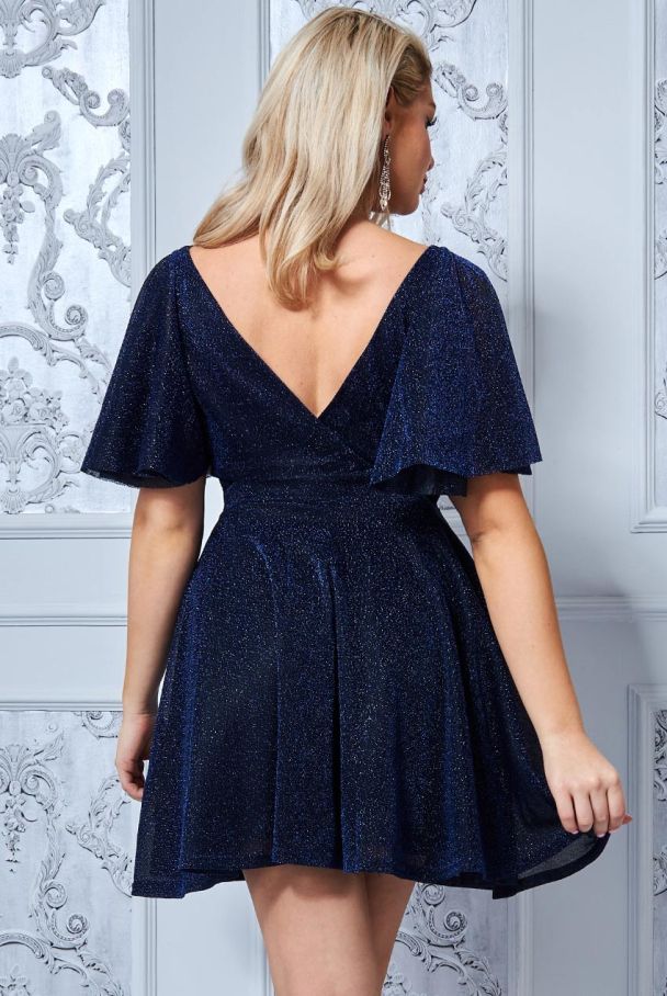 Дамска къса разкроена официална рокля в тъмносиньо с къси ръкави
