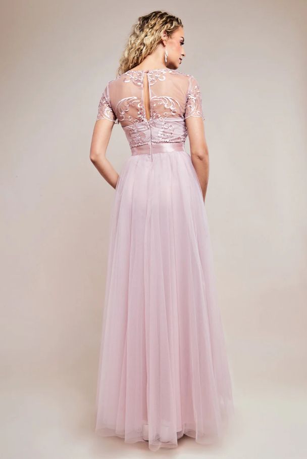 - Елегантна дълга рокля в цвят пудра, с ефирна пола от няколко слоя тюл и красиво бродирана горна част.