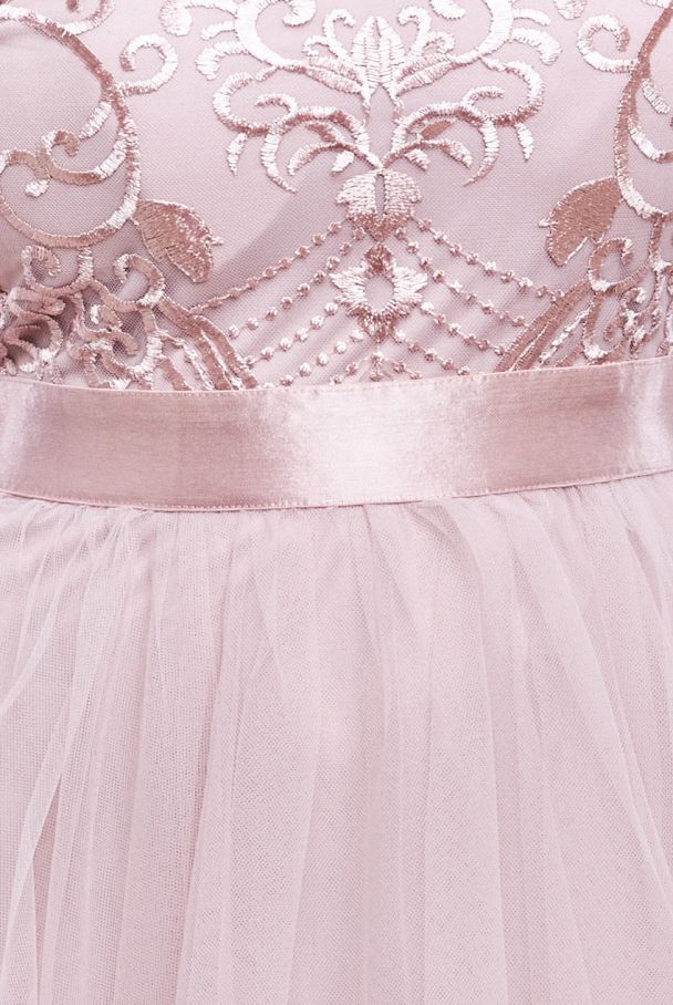 Дамска дълга рокля в цвят пудра от тюл с бродирана горна част и сатенен колан