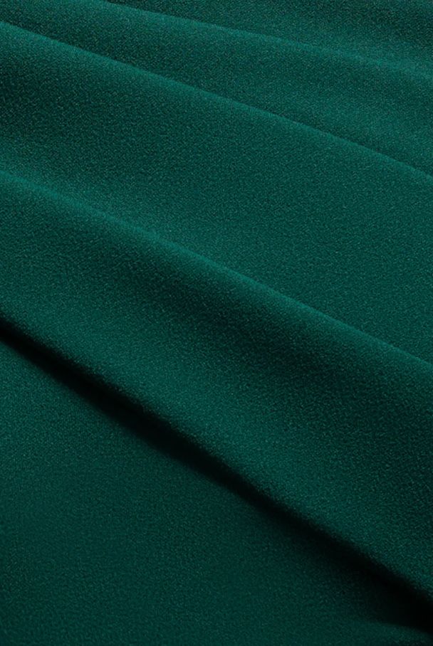 - Класическа и изтънчена дълга рокля в изумрудено зелен цвят с асиметрично голо рамо и мека падаща драперия, която създава ефектен силует.