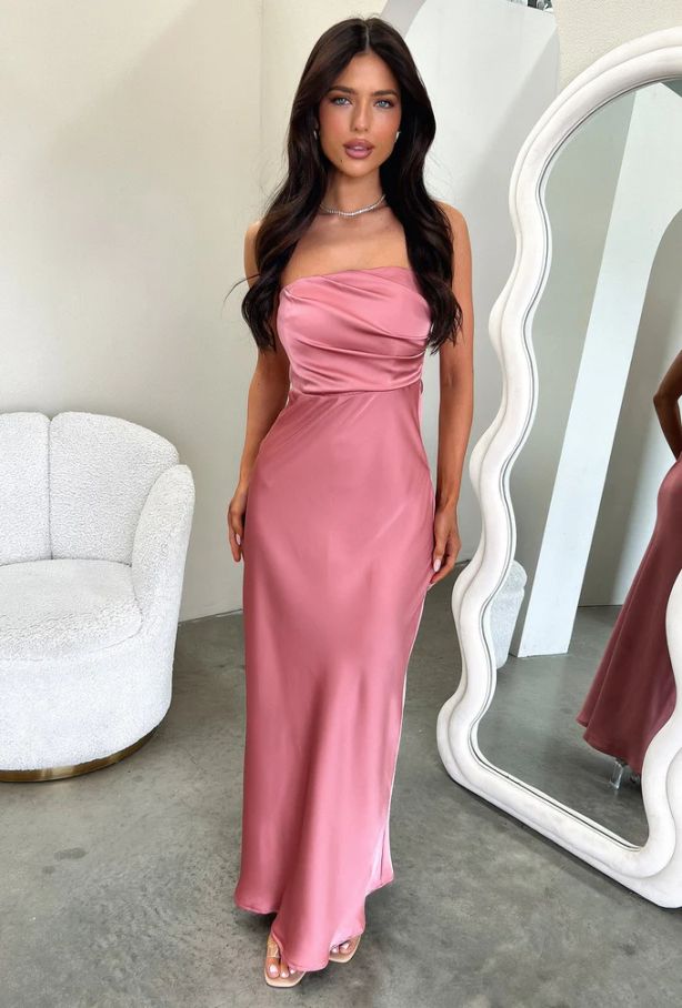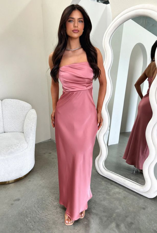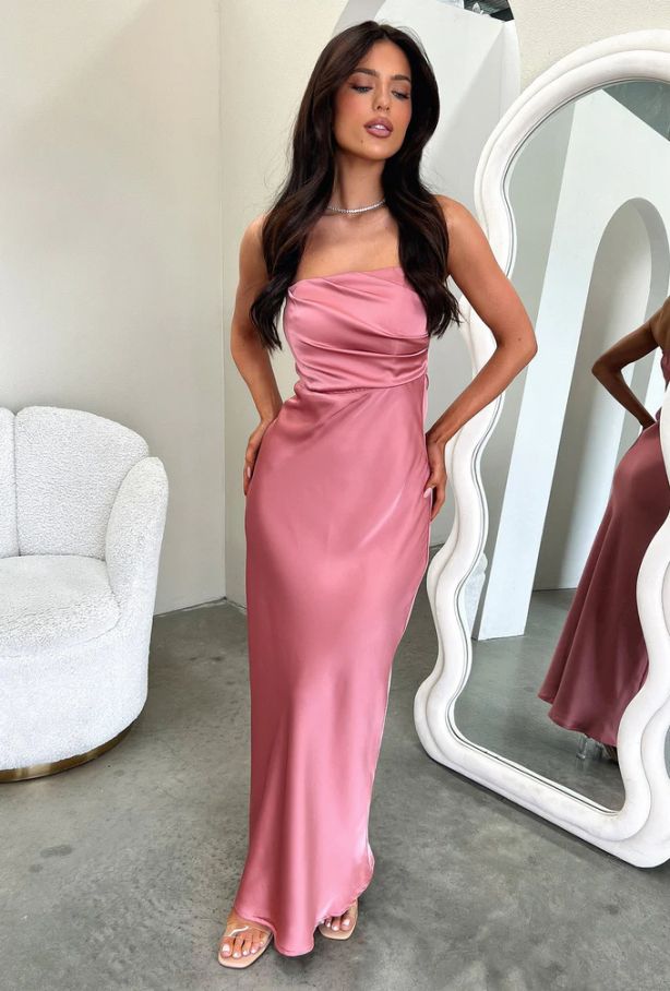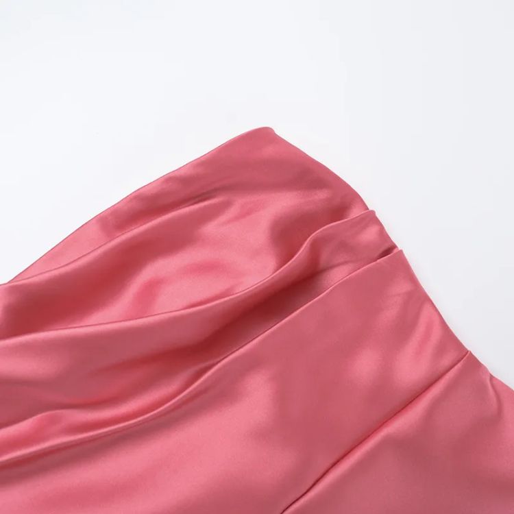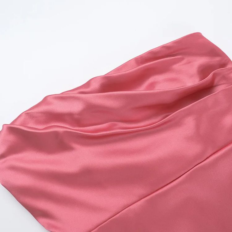 - Елегантна сатенена рокля в розов цвят с изчистена, съблазнителна линия и мек блясък.