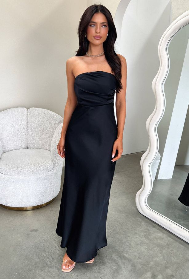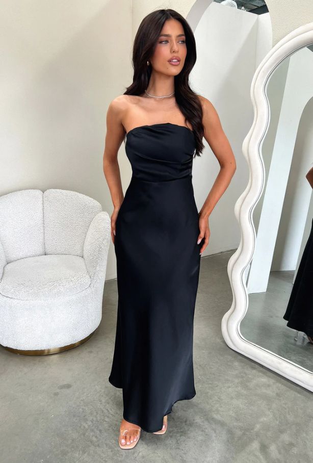 - Елегантна сатенена рокля в черен цвят с изчистена, съблазнителна линия и мек блясък.