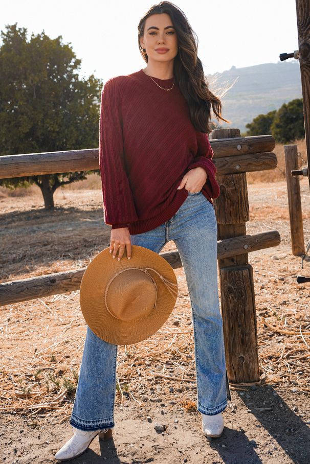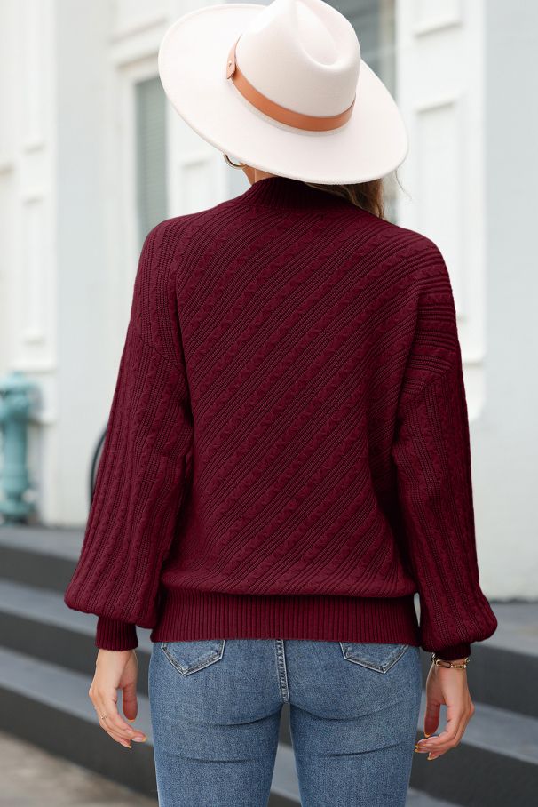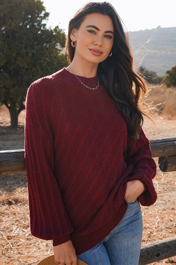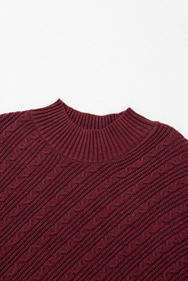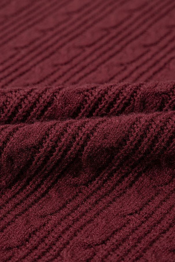• Топъл пуловер в цвят бордо с елегантна релефна плетка, удобна кройка и меки рипсени кантове.
