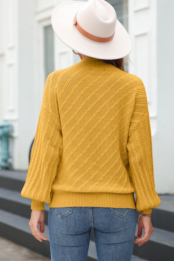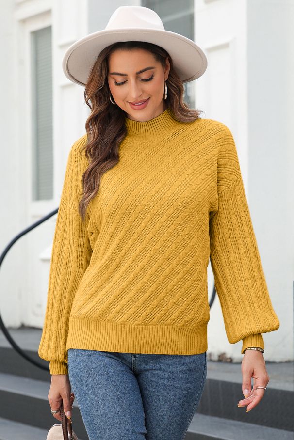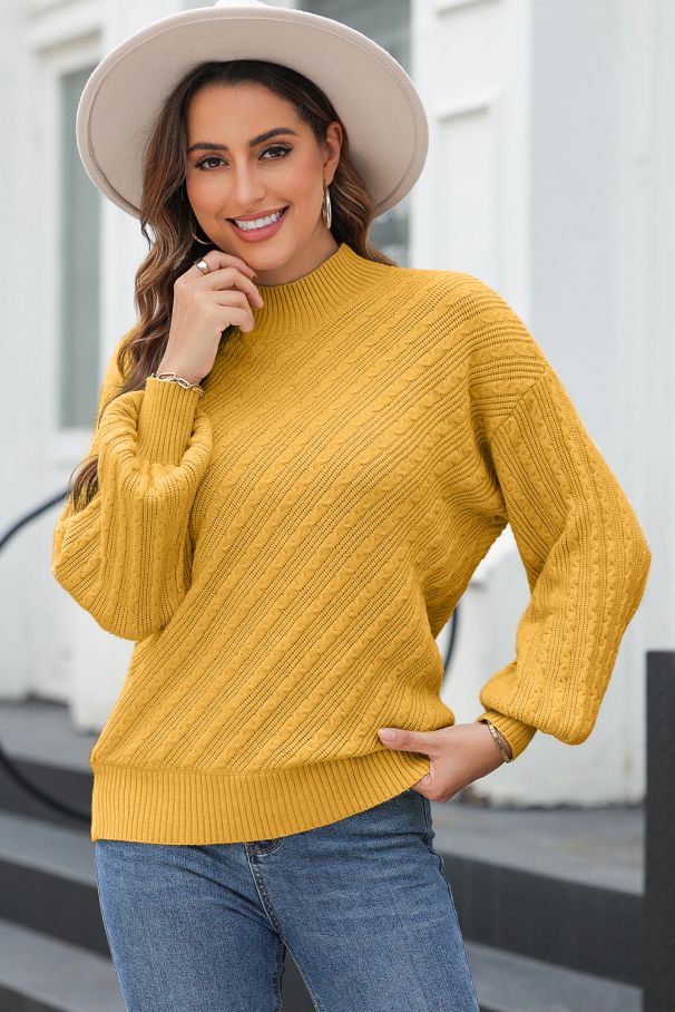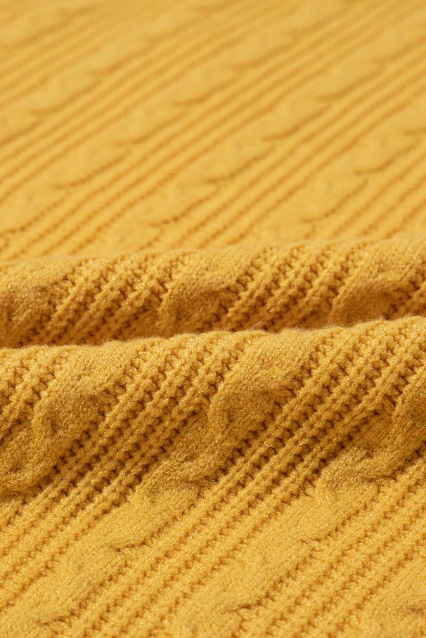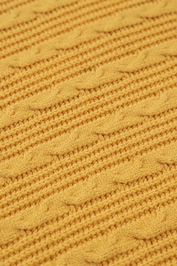 - Топъл пуловер в жълт цвят с елегантна релефна плетка, удобна кройка и меки рипсени кантове.