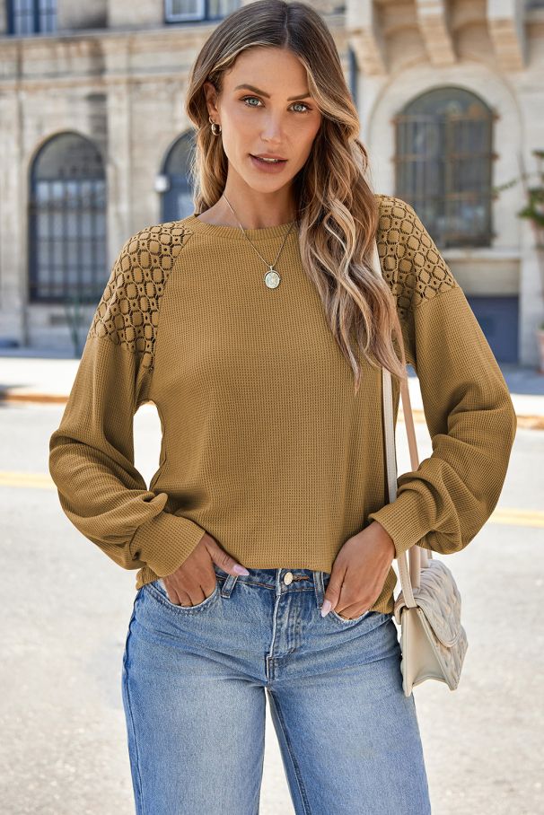 Дамска блуза в цвят охра с дълги ръкави с бродерия