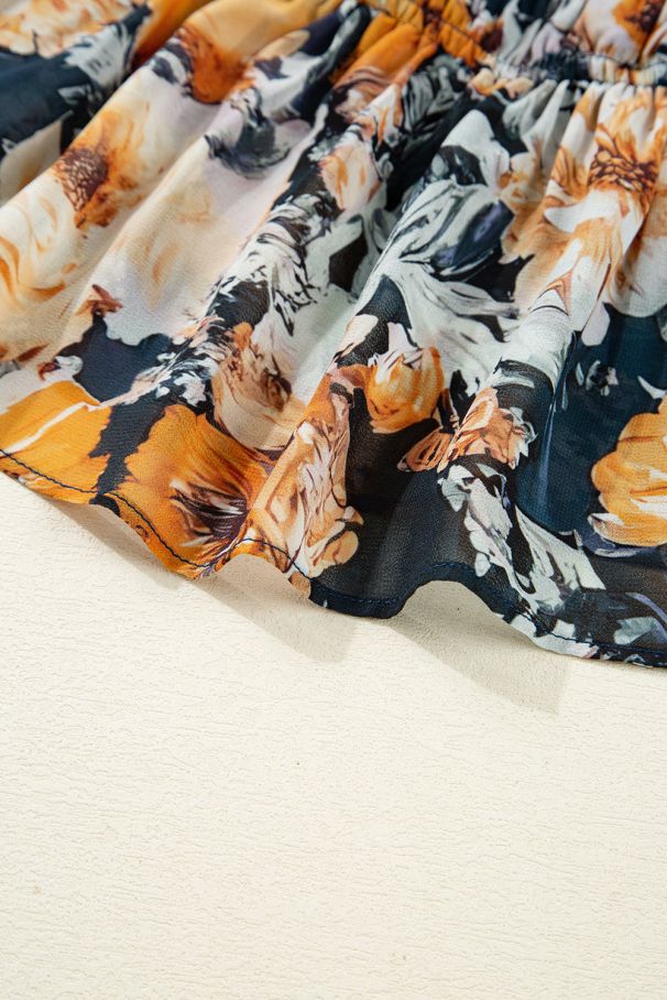 - Блуза с открити рамене и разкроени ръкави, изработена от лека материя с ярък флорален принт.