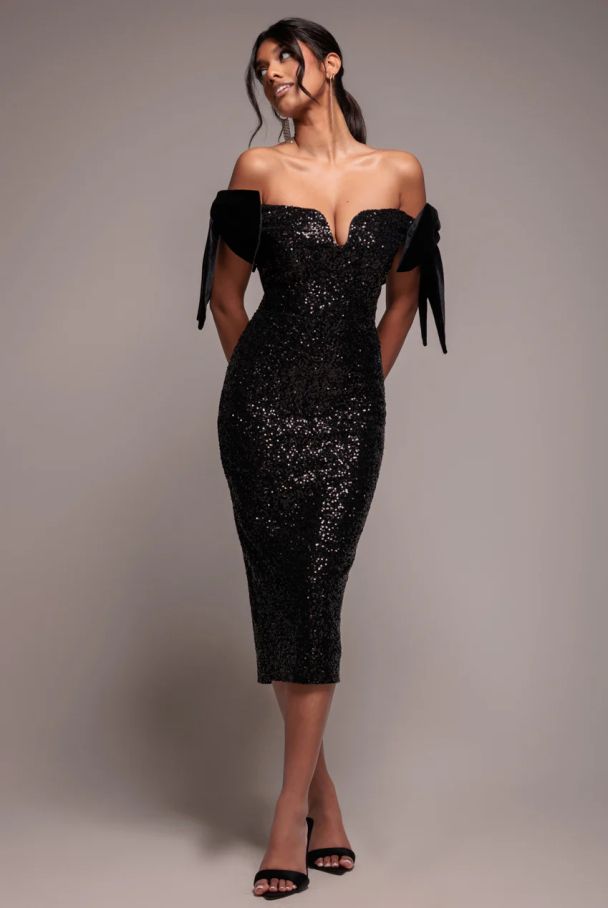 - Елегантна рокля в черно със средна дължина, която комбинира пайети, кадифе и изчистена линия за впечатляваща визия.