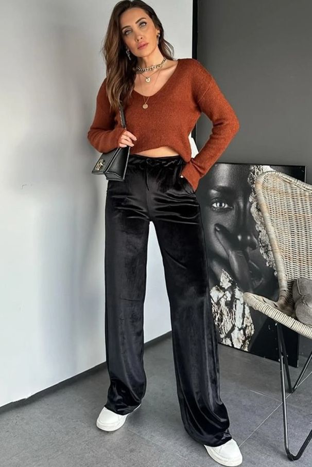 - Стилен кадифен панталон с лек сатенен блясък, които стоят елегантно и същевременно удобно.