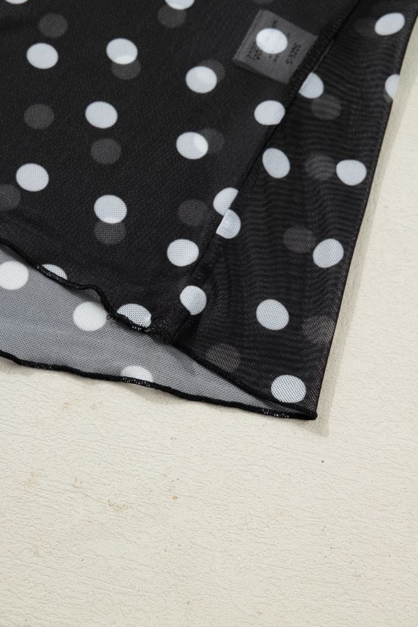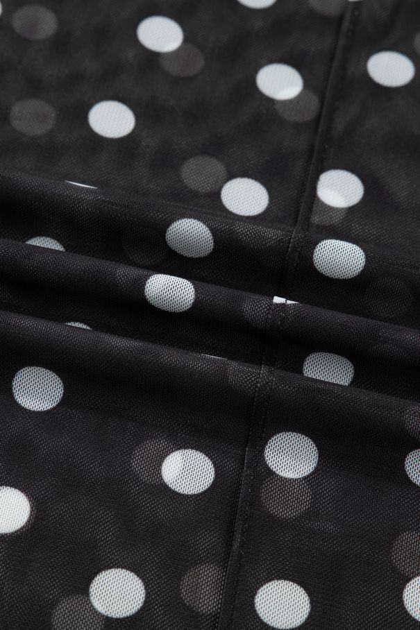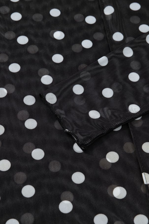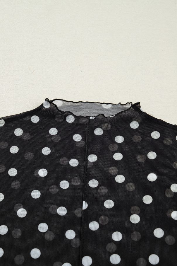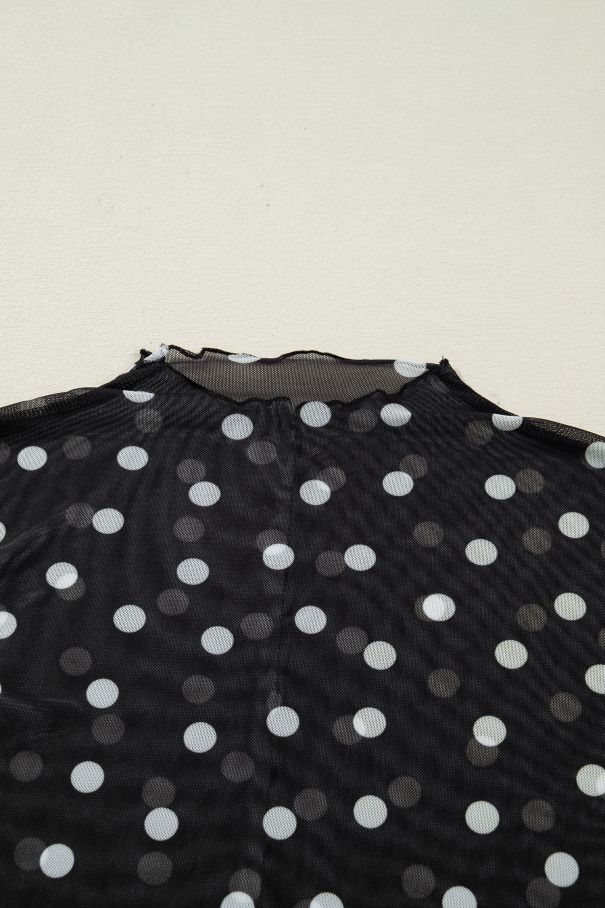 • Черна блуза от фина мрежа с принт на бели точки, висока яка и дълъг ръкав.