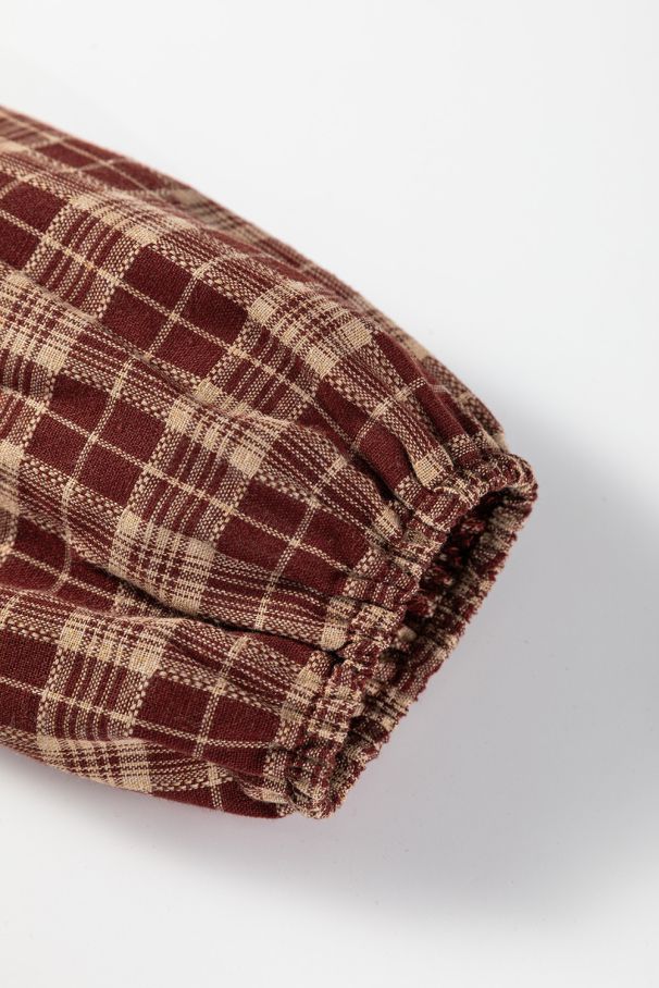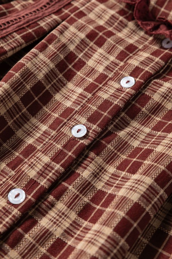 - Дамска риза от 100% памук с кариран десен и декоративна бродерия по подгъва и яката.
